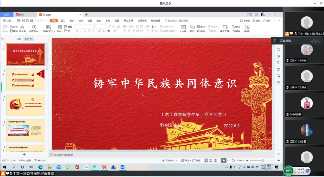 2022年6月5日19:30,伟德官方网站员工第二党支部通过腾讯会议开展了以“铸牢中华民族共同体意识”为主题的党小组学习。参加本次学习的有二支部科创党小组、宣传党小组、活动党小组、学习党小组的全体党员和积极分子。
