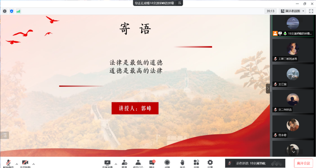 郭峰同志围绕“浅谈法律常识,加强法律意识”的主题展开讲解,法律是指由社会认可国家确认立法机关制定规范的行为规则,并由国家强制力保证实施的,以规定当事人权利和义务为内容的,对全体社会成员具有普遍约束力的一种特殊行为规范。郭峰同志用“用蓝色或黑色字体标注身份证照片用途”、“借钱时签借条而不是欠条”、“租房与房东直接联系”等例子向大家介绍了法律小知识。最后,他强调:期末将至,大家要及时复习所学知识,并祝愿同学们在诚信考试的前提下取得优异的成绩。