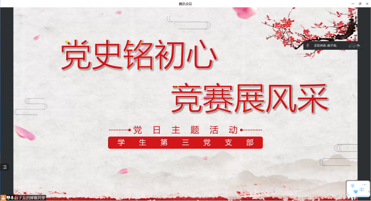 为进一步鼓舞人心,凝聚力量,继承和发扬党的光荣传统和优良作风,坚定共产主义理想信念,加强党史学习教育。伟德官方网站员工第三党支部于2022年5月22日晚19:30,举办本月以“党史铭初心,竞赛展风采”为主题的党日活动。本次活动以腾讯会议形式开展,全体党员同志参加。