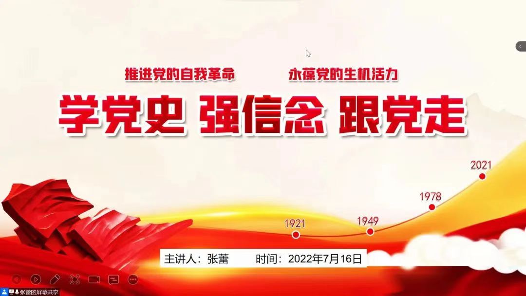 2022年7月16日晚7:30,伟德官方网站员工第一党支部于线上腾讯会议开展了以“学党史强信念跟党走”为主题的党课学习,主讲人为张蕾老师,支部全体党员参与学习。