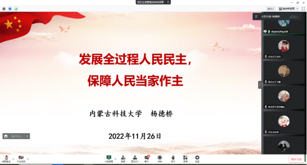 杨德桥老师从全过程人民民主的发展历程、基本内涵、重大意义、基本原则和建设要求五个方面为青马班学员进行了详细的讲解。通过国内外比较、分析真实案例等,使同学们更直观地理解全过程人民民主,是中国共产党团结带领人民追求民主、发展民主、实现民主的伟大创造,是党不断推进中国民主理论创新、制度创新、实践创新的经验结晶。