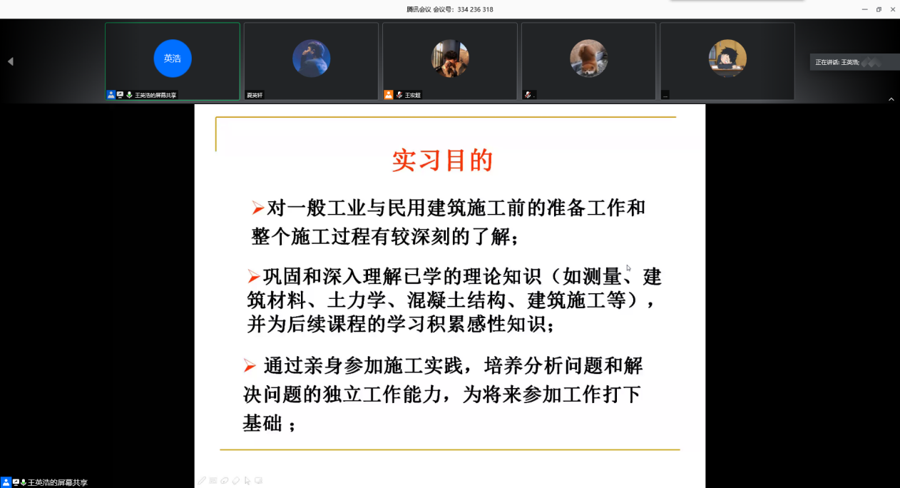 2020年5月14日下午,土木工程系王英浩老师通过视频会议的方式,主持召开了土木工程17级生产实习动员大会。王英浩老师首先强调:疫情期间,公司和系里克服重重困难和挑战,千方百计联系实习单位,为员工提供实习岗位,机会来之不易,同学们要端正态度,认真对待本次实习。