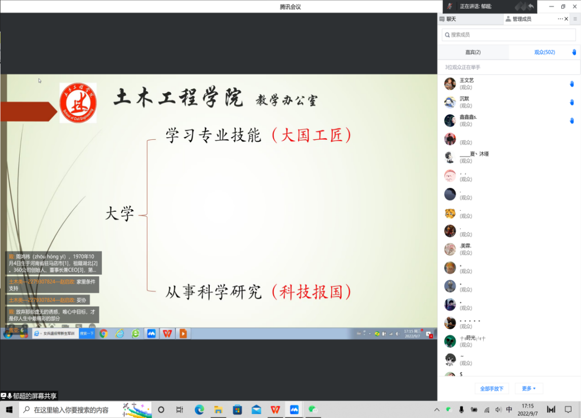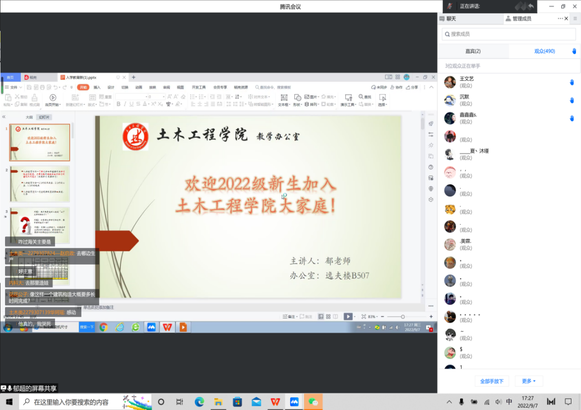 9月7日下午14:30,杨明明老师与2022届新生就“认清就业形势,正确规划老员工活”这个主题进行交流。杨老师结合当前我国面临的机遇与挑战的就业形势下,提醒同学们应结合专业特点制定大学四年学习规划。杨老师希望同学们能够把自己的前途与命运与国家的前途、民族的命运紧密结合起来,合理利用四年时间,增强本领,报效祖国。