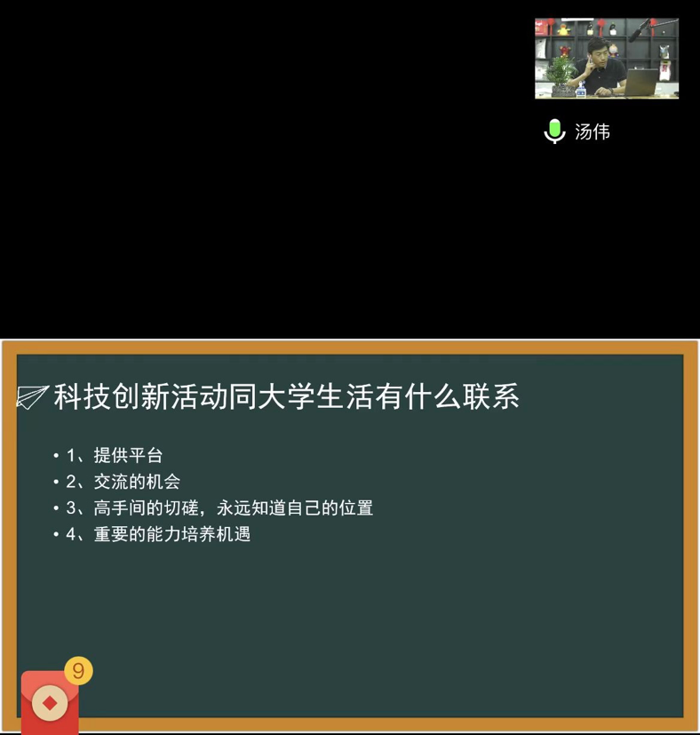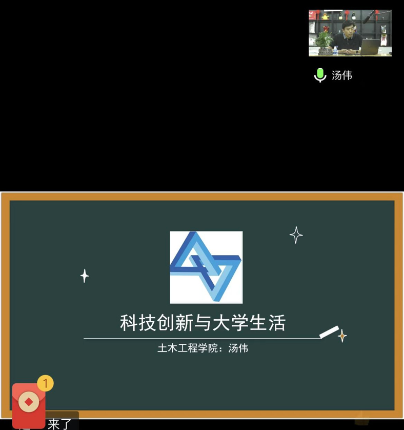 9月6日晚19:00,汤伟老师就老员工科技创新为主题为2022级新生进行详尽细致的讲解。汤老师说,进入21世纪人才毫无疑问将成为时代发展与社会进步的主导因素,想要成为为一名优秀人才,科技创新能力是其必备的素质。汤老师希望各位新生能积极培养创新意识和创新思维,多参加科技创新活动,进而成为科技创新型人才,为祖国的建设添砖加瓦。