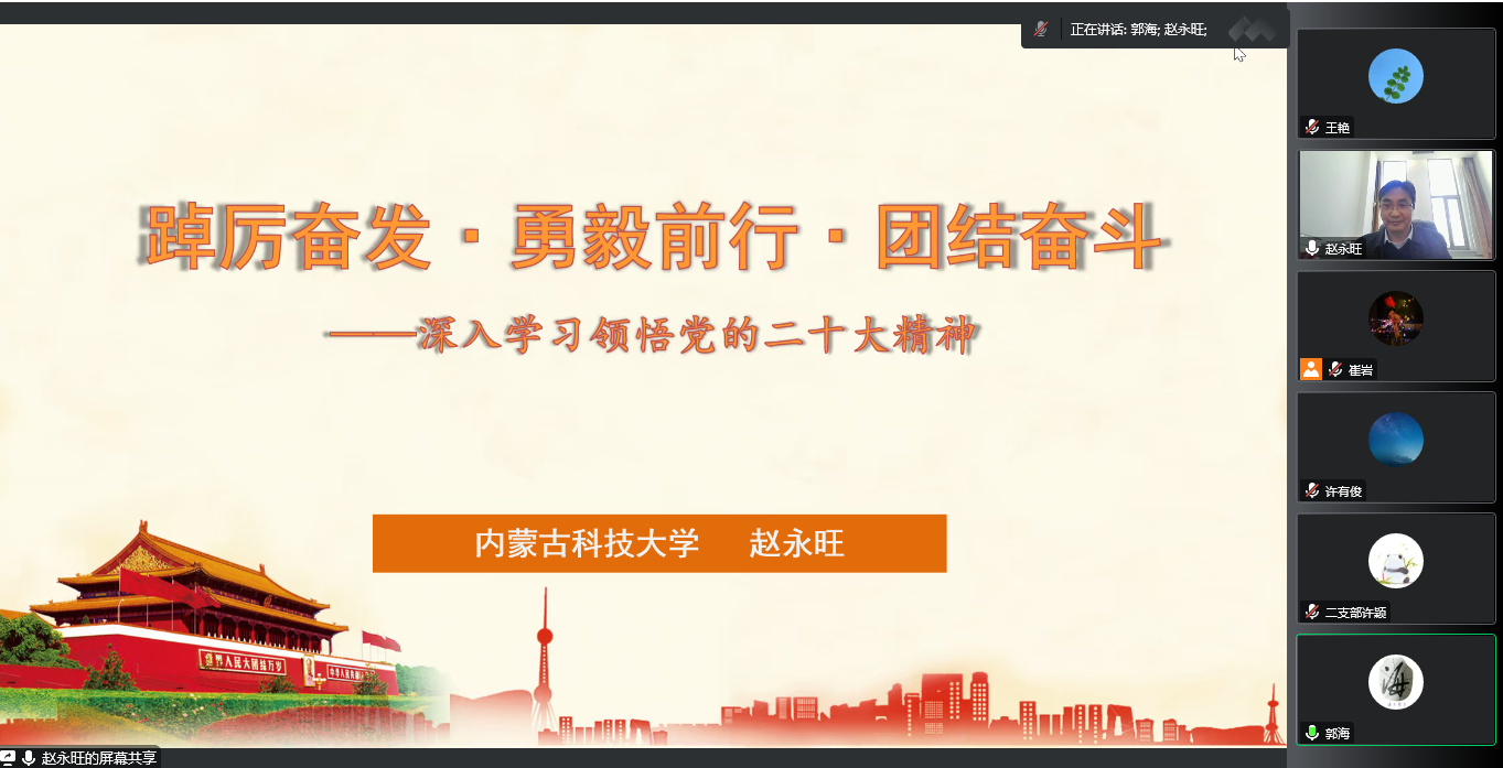 为深入学习宣传贯彻党的二十大精神,把全院师生的思想和行动统一到党的二十大精神上来,把智慧和力量凝聚到党的二十大确定的各项任务上来,12月19日上午10:00,公司特邀公司党委委员、宣传部部长赵永旺作题为“踔厉奋发 勇毅前行 团结奋斗——深入学习领悟党的二十大精神”专题宣讲,公司党委书记郭海主持会议,全体教职工和员工党员参加会议。