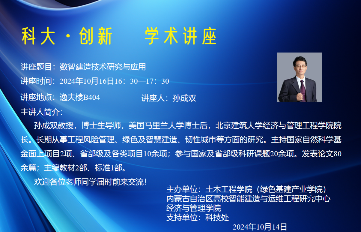 孙成双教授,博士生导师,美国马里兰大学博士后,北京建筑大学经济与管理工程公司经理。长期从事工程风险管理、绿色及智慧建造、韧性城市等方面的研究。主持国家自然科学基金面上项目2项、省部级及各类项目10余项;参与国家及省部级科研课题20余项。发表论文80余篇;主编教材2部、标准1部。