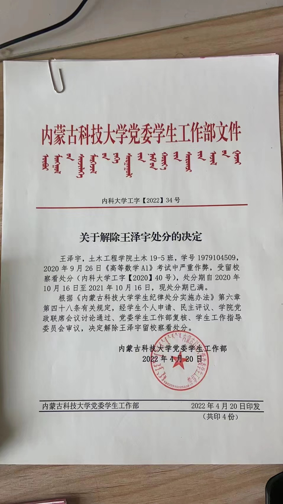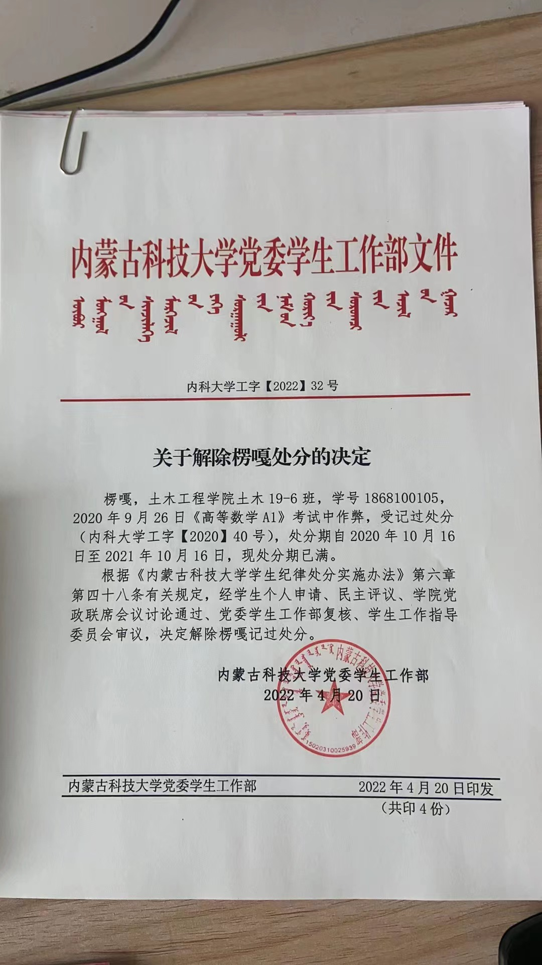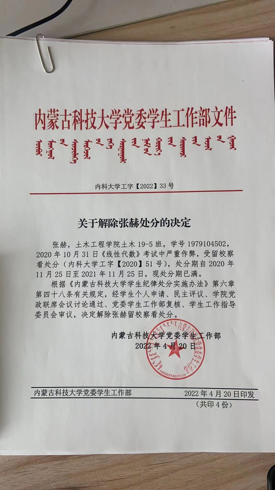 附件二:关于解除警告及严重警告违纪处分决定文件