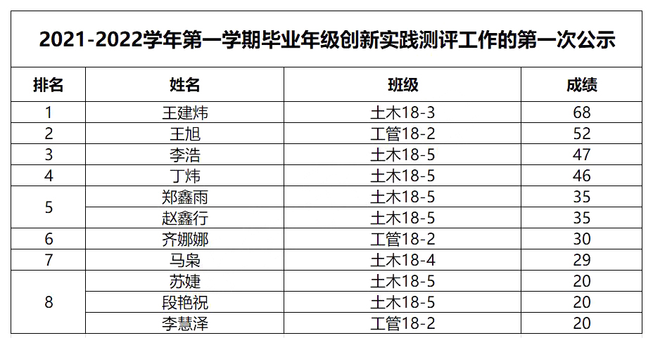 关于2021-2022学年第一学期毕业年级创新实践测评工作的第一次公示通知