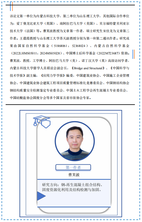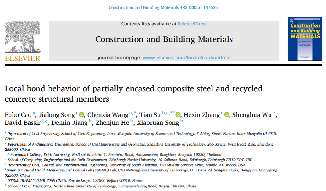 近日,伟德官网城市固体废弃物建材资源化利用团队曹芙波教授在Construction and Building Materials期刊(IF=7.4,中科院1区TOP)发表题为“Local bond behavior of partially encased composite steel and recycled concrete structural members”(DOI: 10.1016/j.conbuildmat.2025.141626)的研究成果。该研究通过推出试验探讨了部分包裹再生混凝土结构构件的黏结行为,并基于灰度相关理论评估了不同参数(再生混凝土强度、锚固长度和栓钉层数)对黏结性能的影响。最终,通过对试验结果统计回归,给出了考虑黏结部位和深度的黏结滑移本构模型。