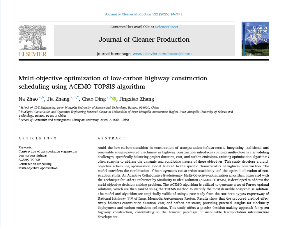 近日,伟德官网智能建造与绿色可持续发展研究团队赵娜讲师在Journal of Cleaner Production期刊(IF=10,中科院1区Top)发表题为“Multi-objective optimization of low-carbon highway construction scheduling using ACEMO-TOPSIS algorithm”(DOI: 10.1016/j.jclepro.2025.146371)的研究成果。该研究聚焦绿色公路建设中的机械调度问题,构建了传统能源机械与可再生能源机械整合应用的多目标调度模型。该模型考虑了施工机械的组合方式以及施工班次的优化配置,开发了自适应协同进化多目标优化算法(ACEMO-TOPSIS)用于平衡项目工期、成本与碳排放的多目标调度决策问题。基于内蒙古某高速公路的案例研究,对该模型和算法进行了实证验证。结果表明,所提出的方法能够有效平衡施工工期、成本和碳排放,为机械配置和碳减排工作提供了切实可行的见解。本研究为绿色公路建设提供了精准的决策方法,助力可持续交通基础设施发展的更广泛范式转型。