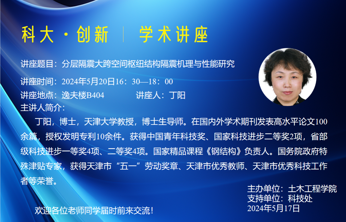 讲座题目:分层隔震大跨空间枢纽结构隔震机理与性能研究