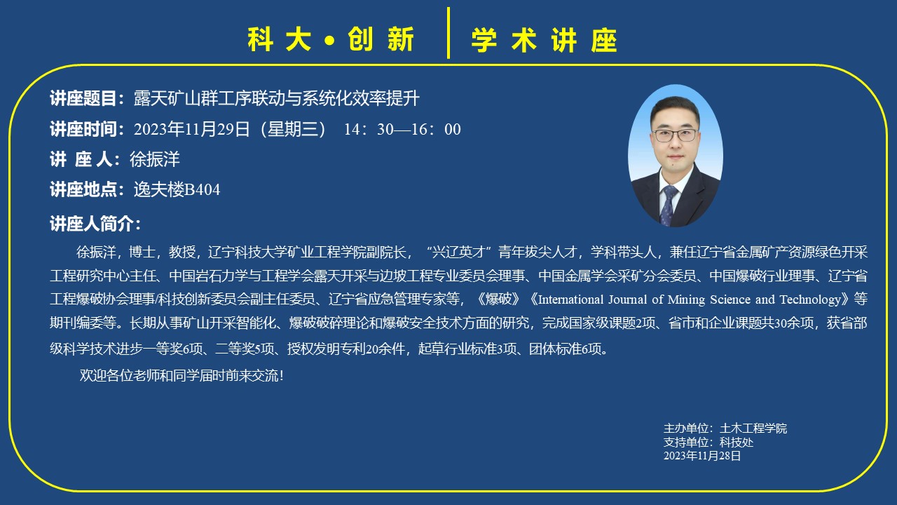 徐振洋,博士,教授,辽宁科技大学矿业工程公司副经理,“兴辽英才”青年拔尖人才,学科带头人,兼任辽宁省金属矿产资源绿色开采工程研究中心主任、中国岩石力学与工程学会露天开采与边坡工程专业委员会理事、中国金属学会采矿分会委员、中国爆破行业理事、辽宁省工程爆破协会理事/科技创新委员会副主任委员、辽宁省应急管理专家等,《爆破》《International Journal of Mining Science and Technology》等期刊编委等。长期从事矿山开采智能化、爆破破碎理论和爆破安全技术方面的研究,完成国家级课题2项、省市和企业课题30余项,获省部级科学技术进步一等奖6项、二等奖5项、授权发明专利20余件,起草行业标准3项、团体标准6项。