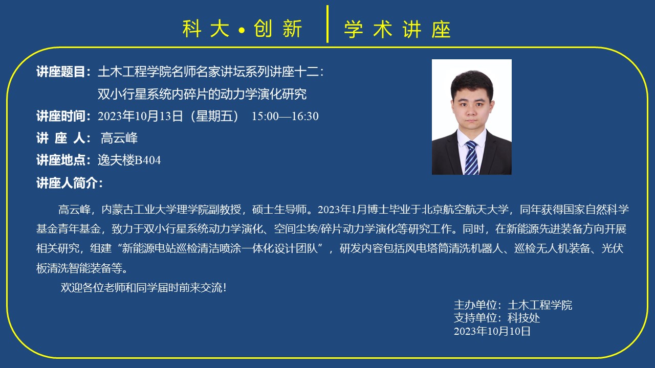 高云峰,内蒙古工业大学理公司副教授,硕士生导师。2023年1月博士毕业于北京航空航天大学,同年获得国家自然科学基金青年基金,致力于双小行星系统动力学演化、空间尘埃/碎片动力学演化等研究工作。同时,在新能源先进装备方向开展相关研究,组建“新能源电站巡检清洁喷涂一体化设计团队”,研发内容包括风电塔筒清洗机器人、巡检无人机装备、光伏板清洗智能装备等。