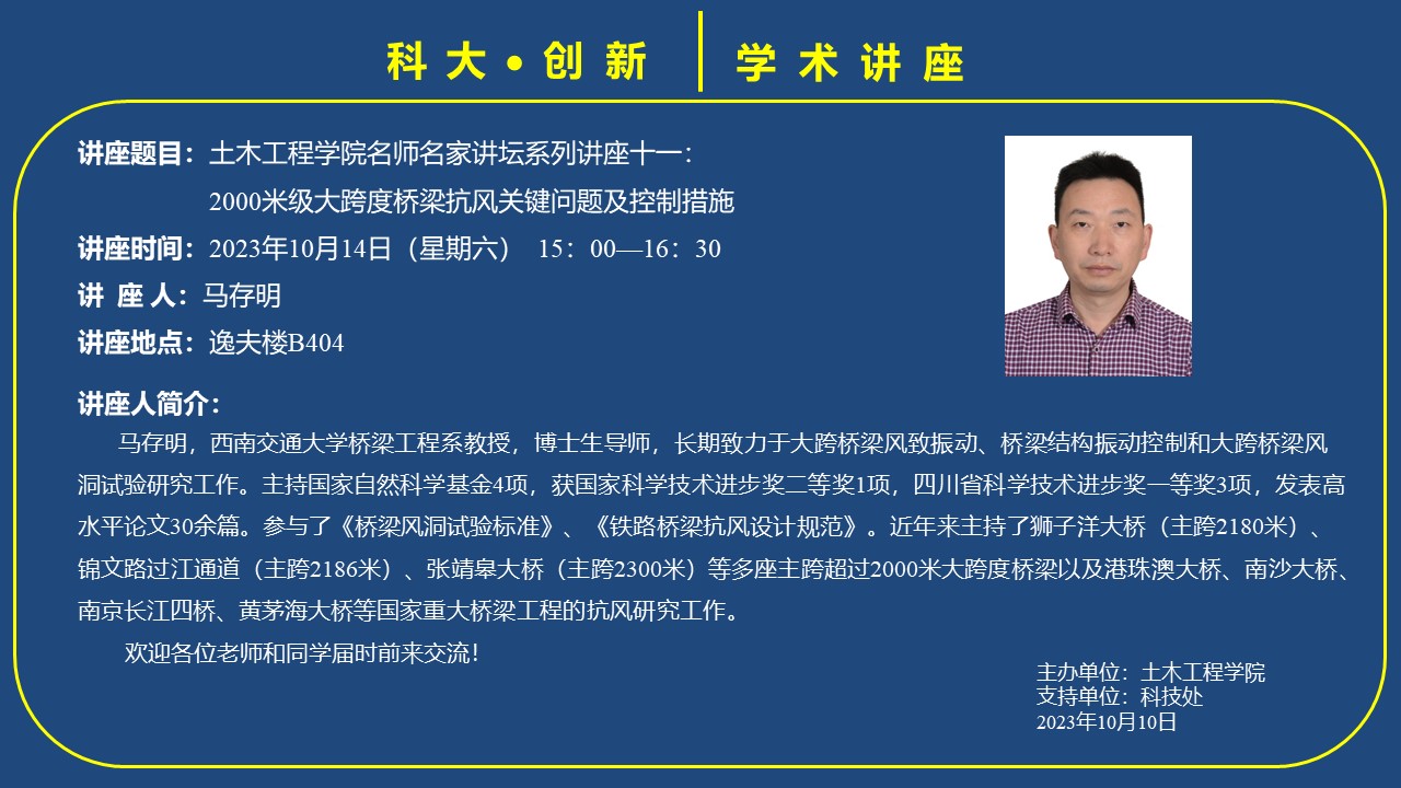 马存明,西南交通大学桥梁工程系教授,博士生导师,长期致力于大跨桥梁风致振动、桥梁结构振动控制和大跨桥梁风洞试验研究工作。主持国家自然科学基金4项,获国家科学技术进步奖二等奖1项,四川省科学技术进步奖一等奖3项,发表高水平论文30余篇。参与了《桥梁风洞试验标准》、《铁路桥梁抗风设计规范》。近年来主持了狮子洋大桥(主跨2180米)、锦文路过江通道(主跨2186米)、张靖皋大桥(主跨2300米)等多座主跨超过2000米大跨度桥梁以及港珠澳大桥、南沙大桥、南京长江四桥、黄茅海大桥等国家重大桥梁工程的抗风研究工作。
