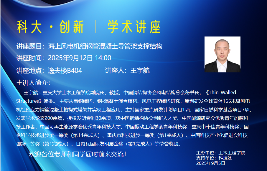 王宇航,重庆大学伟德官方网站副经理、教授,中国钢结构协会风电结构分会秘书长,《Thin-Walled Structures》编委。 主要从事钢结构、钢-混凝土混合结构、风电工程结构研究,原创研发全球首台165米级风电机组预应力钢管混凝土格构式塔架并实现工程应用。主持国家重点研发计划项目1项、国家自然科学基金项目7项,发表学术论文200余篇,授权发明专利30余项,获中国钢结构协会创新人才奖、中国能源研究会优秀青年能源科技工作者、中国可再生能源学会优秀青年科技人才、中国振动工程学会青年科技奖、重庆市十佳青年科技奖、国家科学技术进步奖一等奖(第14完成人)、重庆市科技进步一等奖(第1完成人)、中国科技产业化促进会科技创新一等奖(第1完成人)、日内瓦国际发明展金奖(第1完成人)等荣誉奖励。